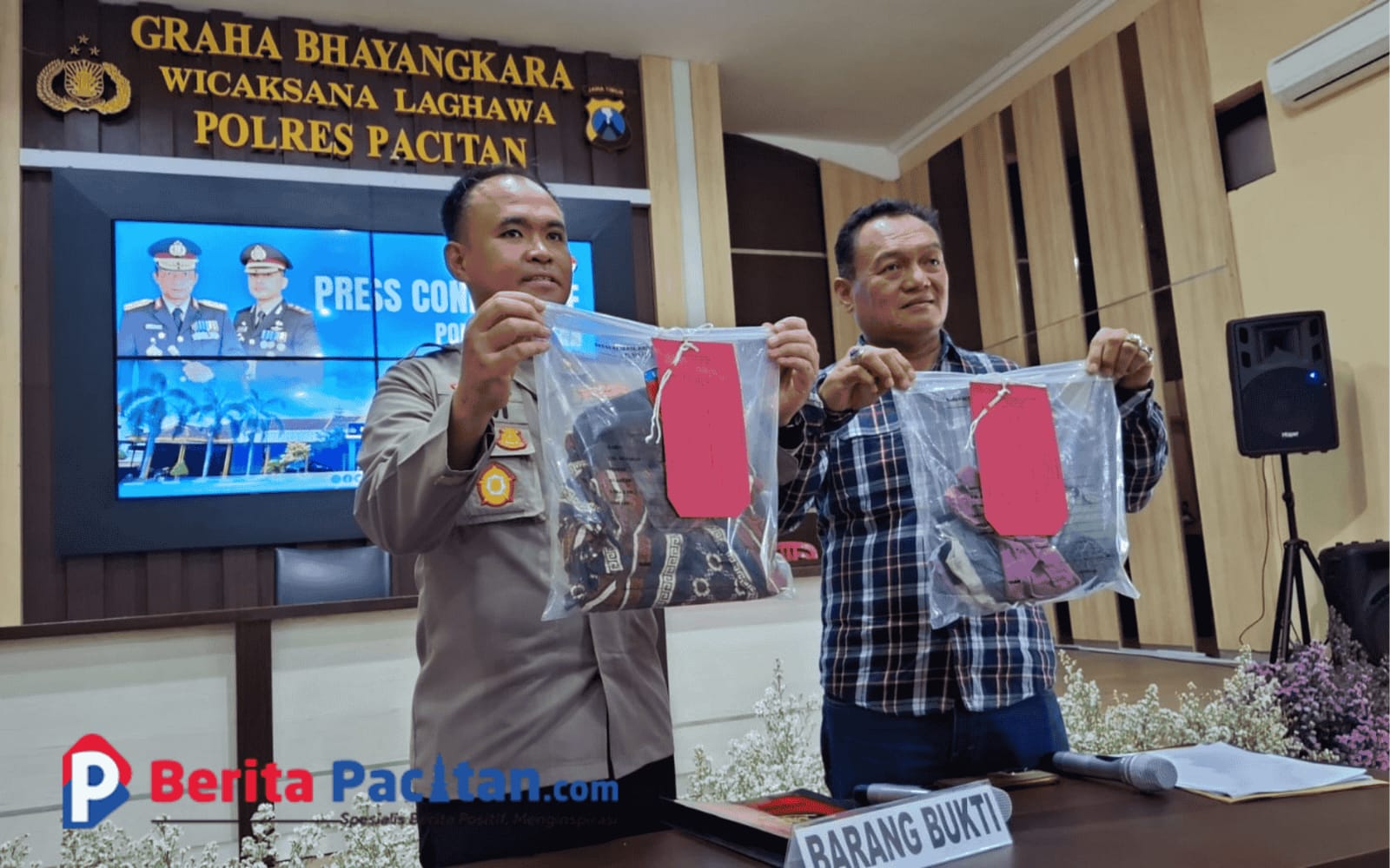 Polisi tengah menunjukkan barang bukti berupa pakaian korban. (Foto: Sunardi Berita Pacitan).