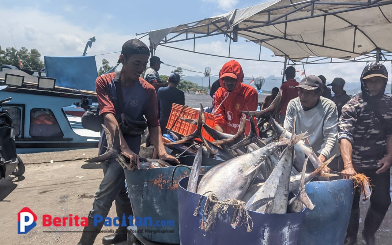 Aktivitas nelayan di Pelabuhan Tamperan, Pacitan, saat menurunkan hasil tangkapan cumi, tuna, ronang, dan cakalang yang tengah melimpah. (Foto: Sunardi/Berita Pacitan).