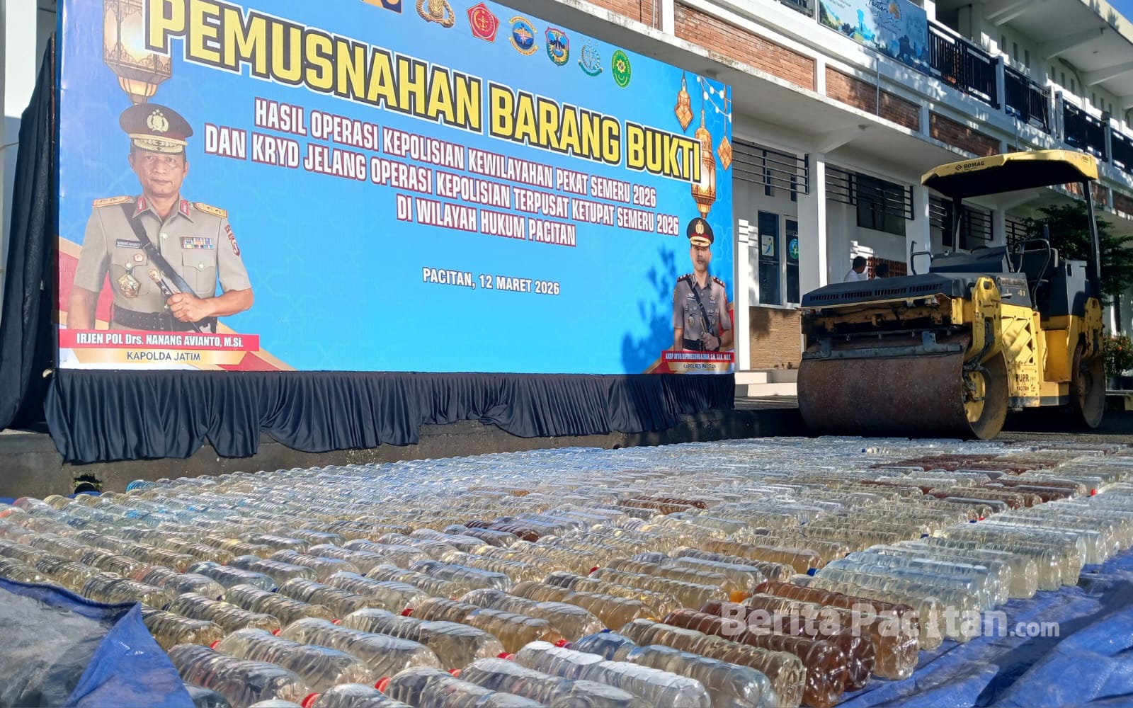 Beritapacitan.com, PACITAN – Kepolisian Resor Pacitan memusnahkan ratusan botol minuman keras (miras) hasil penindakan dalam Operasi Pekat Semeru 2026 serta Kegiatan Rutin Yang Ditingkatkan (KRYD) menjelang Operasi Ketupat Semeru 2026.