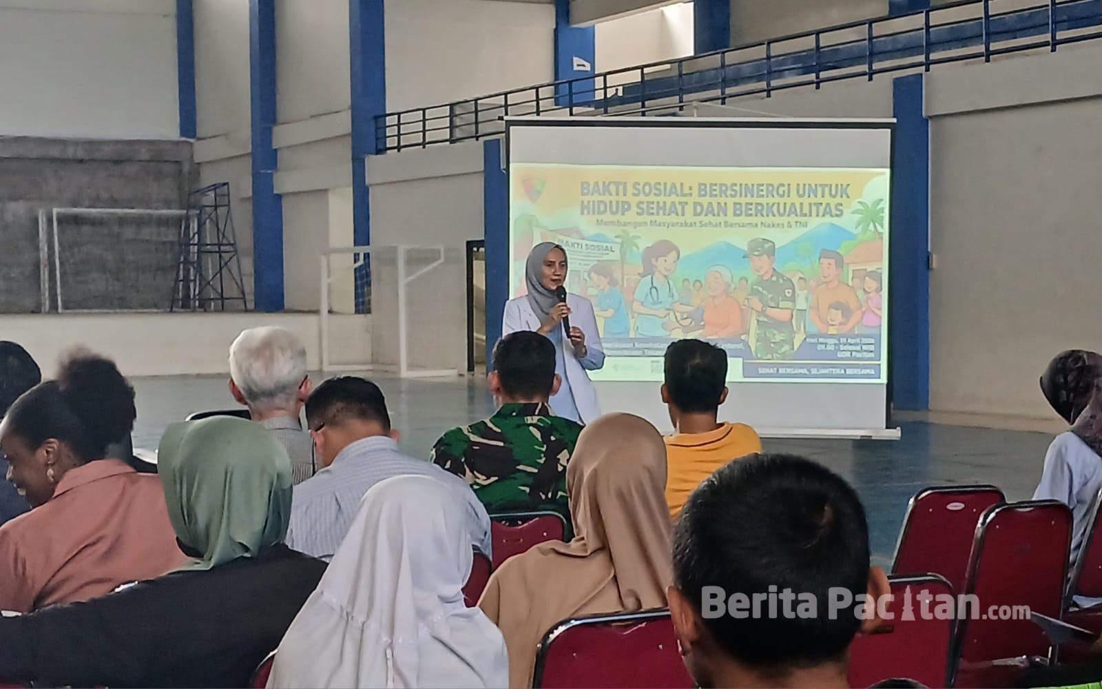 Kegiatan penyuluhan kesehatan oleh dokter dari UNS di Acara Cek Kesehatan Gratis yang digelar oleh Yonif TP 934 SBY di GOR Pacitan, Minggu, 19 April 2026. (Foto: Sunardi/Berita Pacitan)